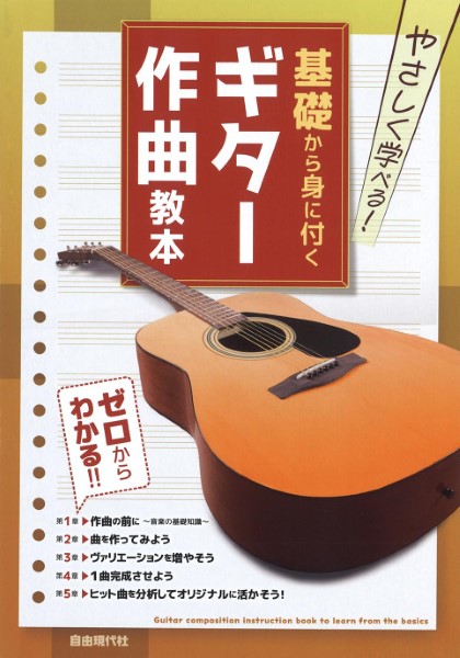 (株)自由現代社 【9784798226156】【2615】 ギターを弾きながらオリジナル曲を作りたい人に向けた作曲教本。コード進行、メロディの作り方、様々なリズムの仕組みをゼロから解説し、作曲するための材料としてパターンを多数掲載。巻末では人気アーティストのヒット曲を分析。ヒット曲から作曲のコツをポイントごとにまとめた内容充実の一冊。