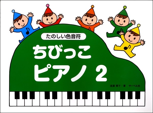 また、ファとソは動きにくい指を使うことから、子供たちにとっては一巻の時よりペースがゆっくりになるかもしれませんが、十分な量の課題を用意していますので、一曲一曲にじっくりと取り組んでいってください。使い方は、一巻と同様に、左ページで歌とリズムを練習し、右ページをピアノでひきます。また、本書の色音符と並行して普通の音符を学ぶのが望ましいと思われますので、「ちびっこワーク・ブック」をぜひ併用してください。楽しく音符を覚えながら、本書の内容を一層有意義にすることができます。