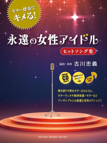 コードをかき鳴らすだけ、単調なアルペジョだけの「弾き語り曲集」とは一線を画し、ギター伴奏にこだわり抜いたヒットソング集の第 2 弾『ギター伴奏でキメる!永遠の女性アイドル ヒットソング集』がついに刊行!昭和を彩った女性アイドルたちの名曲 18 曲を収載しました。模範演奏 CD はギター伴奏のみとメロディー入りの 2 枚組、BGM としてもおススメです。もちろん全曲タブ譜付き。編曲・演奏は『永遠のヒットソング集』『ベンチャーズ名曲集』で人気の名手・古川忠義