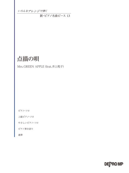 デプロMP 【9784866338569】【3856】【収録曲】点描の唄 <ピアノ・ソロ>/点描の唄 <上級ピアノ・ソロ>/点描の唄 <やさしいピアノ・ソロ>/歌詞/点描の唄 <ピアノ弾き語り>/点描の唄 <連弾> Mrs. GREEN APPLE feat.井上苑子 の人気デュエット曲を5種類のアレンジで掲載。※旧版「いろんなアレンジで弾く ピアノ名曲ピース 68 点描の唄 (ISBN978-4-86633-381-6 JAN4589496593815)」 の新装版です。掲載楽譜に変更はございません。【掲載アレンジ】ピアノ・ソロ(中級)/ピアノ・ソロ(初級)/ピアノ・ソロ(上級)/ピアノ弾き語り/連弾。
