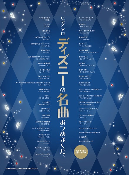 (株)シンコーミュージックエンタテイメント 【9784401043323】【04332】【収録曲】いつか王子様が「白雪姫」/ハイ・ホー「白雪姫」/星に願いを「ピノキオ」/ビビディ・バビディ・ブー「シンデレラ」/これが恋かしら(ジャズ・アレンジ)「シンデレラ」/夢はひそかに「シンデレラ」/ふしぎの国のアリス(ジャズ・アレンジ)「ふしぎの国のアリス」/右から2番目の星「ピーター・パン」/きみもとべるよ!「ピーター・パン」/チム・チム・チェリー「メリー・ポピンズ」/スーパーカリフラジリスティックエクスピアリドーシャス「メリー・ポピンズ」/お砂糖ひとさじで「メリー・ポピンズ」/ララルー「わんわん物語」/いつか夢で「眠れる森の美女」/くまのプーさん「くまのプーさん」/美女と野獣「美女と野獣」/ひとりぼっちの晩餐会「美女と野獣」/パート・オブ・ユア・ワールド「リトル・マーメイド」/アンダー・ザ・シー「リトル・マーメイド」/フレンド・ライク・ミー「アラジン」/ホール・ニュー・ワールド「アラジン」/スピーチレス〜心の声「アラジン」/サークル・オブ・ライフ「ライオン・キング」/愛を感じて「ライオン・キン