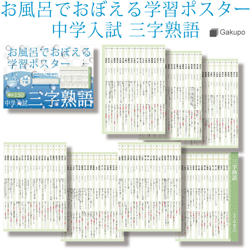 Gakupo お風呂でおぼえる学習ポスター 中学入試 三字熟語 頻出150 A4ポスター7枚セット 中学受験 国語 防水 教材