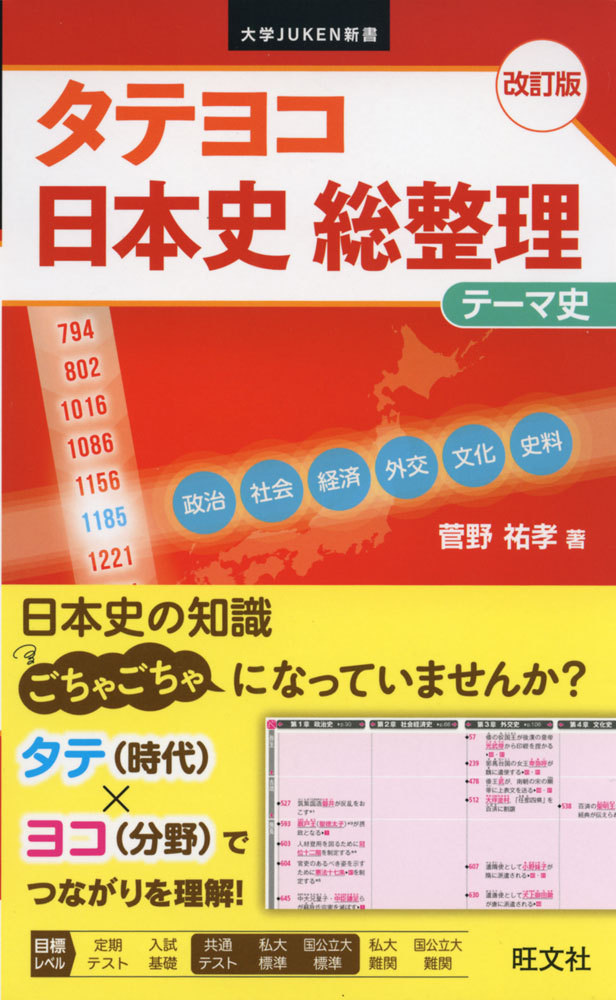 日本史を「タテ(時代)」と「ヨコ(分野)」で整理するための参考書。それぞれの項目に関して、歴史事象を「タテ(時代)」と「ヨコ(分野)」でリンクさせながら確認し、歴史用語の混乱を解消させることを目的に編集。