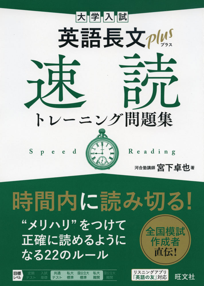 最近の大学入試問題から長文読解問題10題を厳選。22個の「スピードアップルール」を通して、近年、語数がますます増加傾向にある難関〜中堅私立大の入試長文を、時間内に正確に読み切るための「メリハリをつけた読解メソッド」が習得できる。