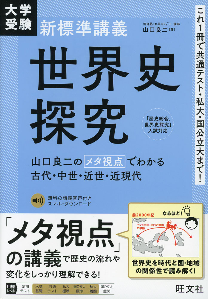 1冊で、古代から現代まで、通史が全部学習できる。受験レベルは、共通テスト・私大受験・国公立二次(※最難関以外)まで対応。「メタマッピングとメタ視点」によって、どの時代の、どの国・地域の、どの内容を学習しているのかを意識しながら進めることができる。