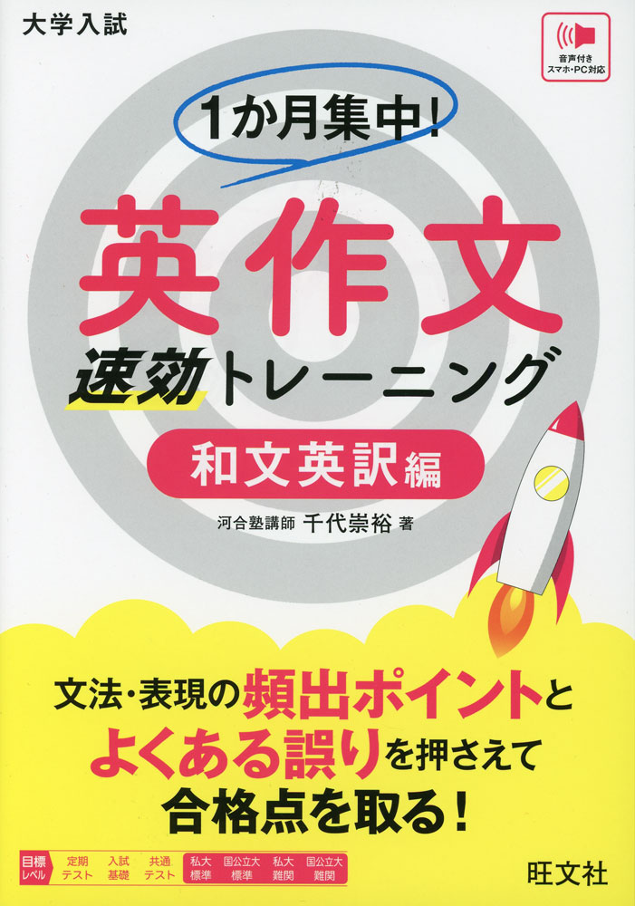 大学入試1か月前からでも集中して取り組むことで、試験本番の英作文において減点を回避し、必要な得点を確実に取れるようになることを目的とした問題集。作文の基本的な心構えやポイントを厳選して収録。