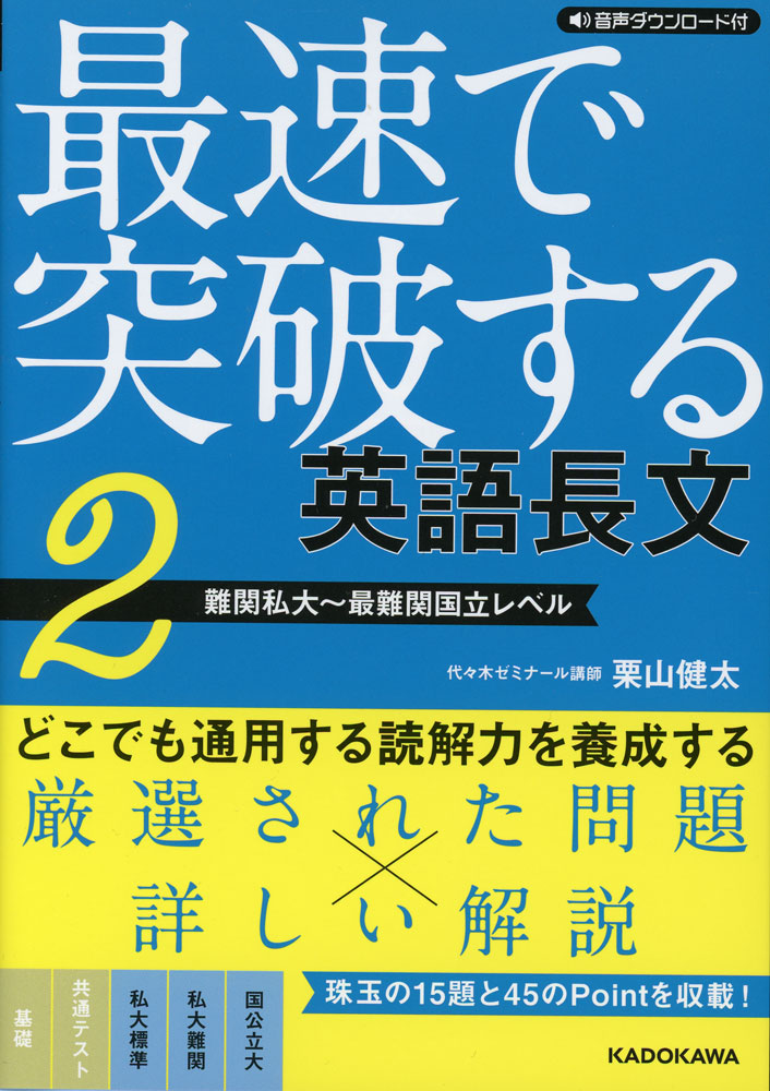 難関私大〜最難関国立レベルの15題を収載。単語や熟語、文法事項まで基礎から徹底解説。読解に役立つPointを40個以上掲載。ネイティブスピーカーによる読み上げ音声付き。