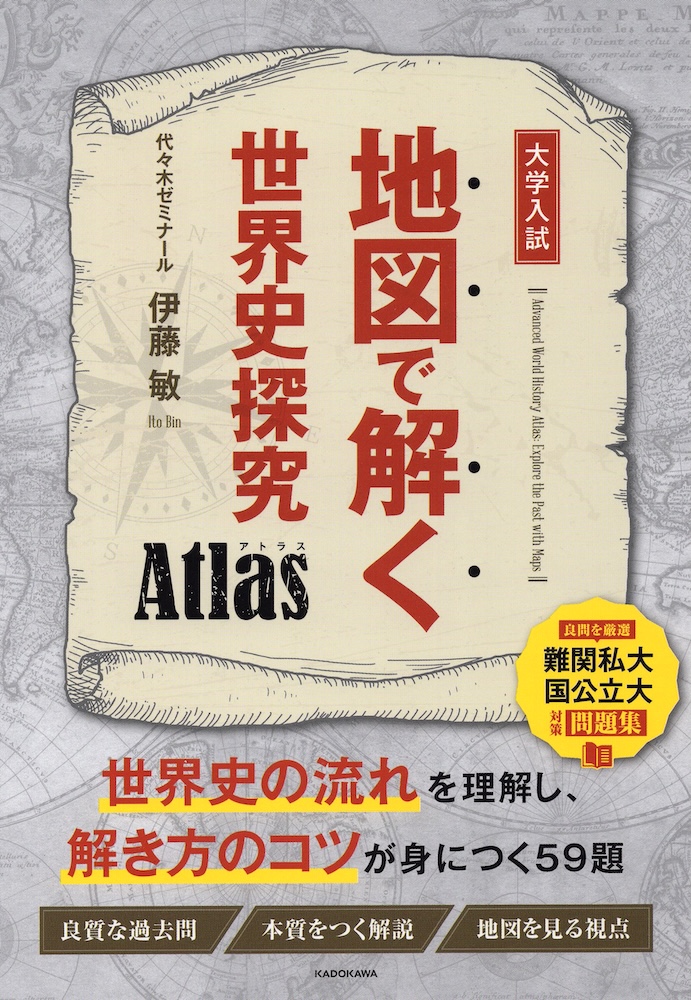 世界史の流れを理解したうえで、解き方のコツが身につく59題を集めた問題集。「地図をきっかけに世界史を「考える(解く)」」ことをコンセプトにしている。