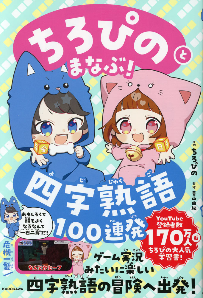「ちろぴの」と一緒に、小学生のうちに覚えておきたい四字熟語100語を楽しみながら学べる学習書。マインクラフトの実況をもとにしたストーリーの中で、四字熟語の意味や使い方、似た意味の言葉や反対の意味の言葉まで楽しく学べる。