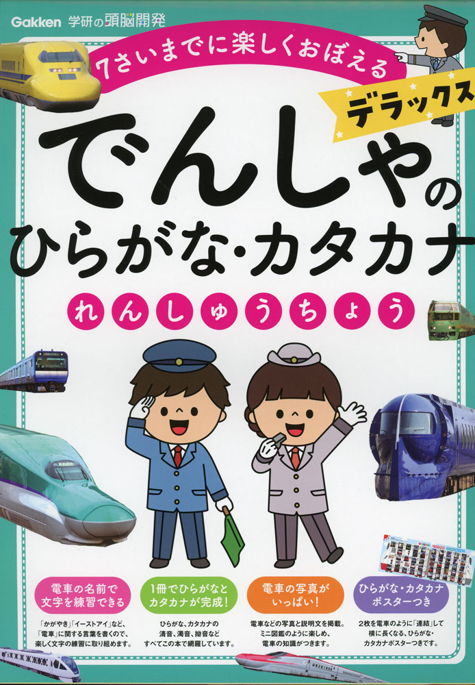 電車の名前で文字を練習できる。1冊でひらがなとカタカナが完成。電車の写真がいっぱい。ひらがな・カタカナポスターつき。