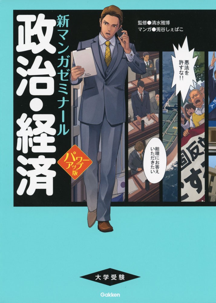 「民主政治と基本的人権」「日本の政治制度と現状」「経済体制と理論」「日本の経済・社会の現状」「世界の政治・経済」の5章、94テーマで構成。各テーマはマンガで解説。別冊「政治・経済 日本国憲法ドリル」付き。