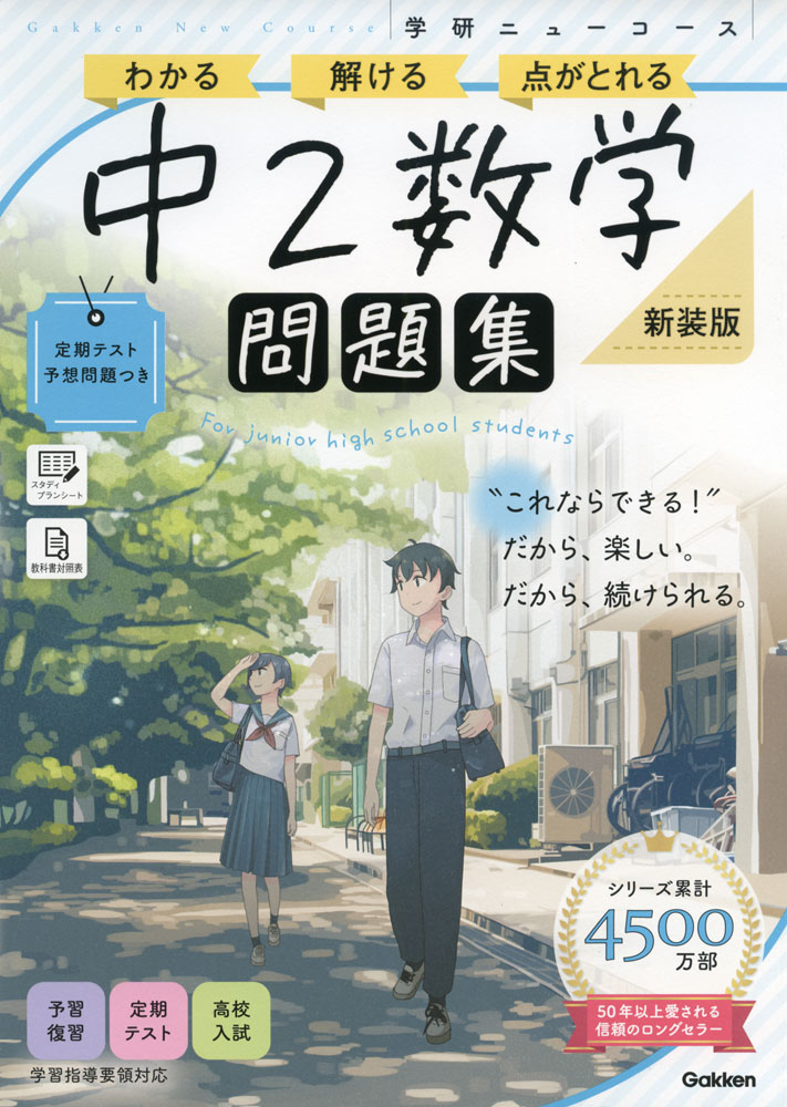 基礎〜標準〜高校入試レベルの問題まで、豊富に掲載しているので、しっかり問題演習できる。ステップ式の構成で無理なく実力アップ。「定期テスト予想問題」は、制限時間と配点つき。スタディプランシートでスケジューリングもサポート。