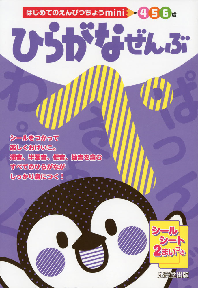 シールをつかって楽しくおけいこ。濁音、半濁音、促音、拗音を含むすべてのひらがながしっかり身につく。シールシート2まいつき。