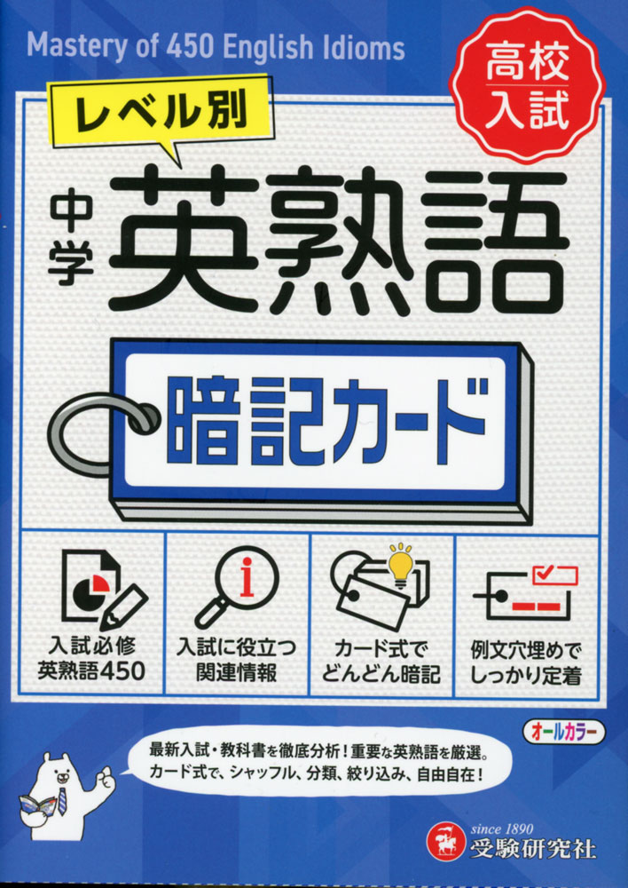 「中学 英熟語 500」から450語を収録。カードには、訳文の穴うめ問題(表面)と英文の穴埋め問題(裏面)を掲載。