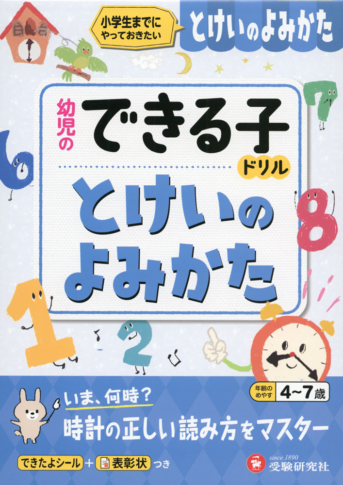 数字の読み書きからデジタル時計、アナログ時計の読み方までが正しく早くわかる、幼児のためのドリル。年齢のめやす:4〜7歳。