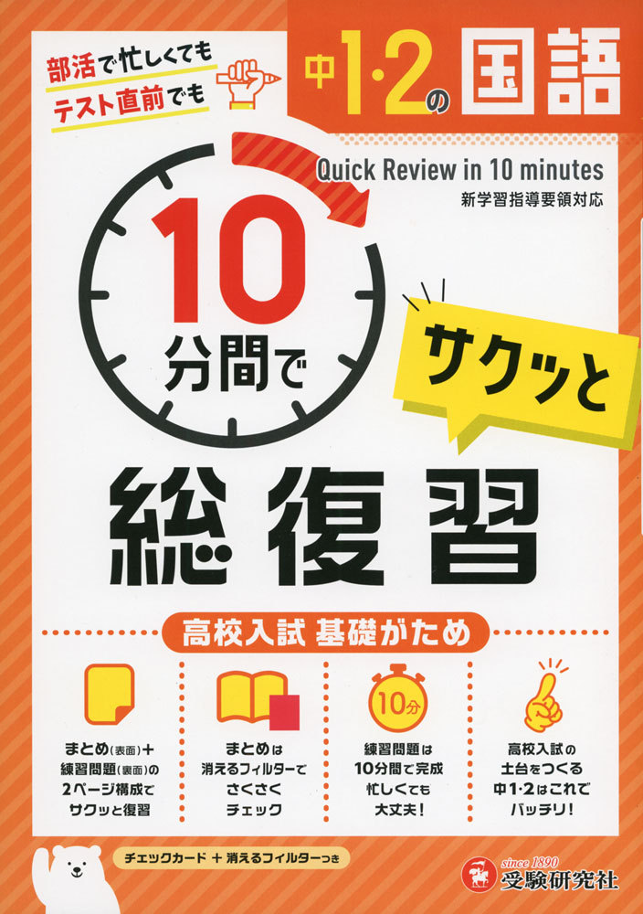 基礎を「短い時間で、気軽に復習できる」ようにつくられた問題集。まとめ(表面)+練習問題(裏面)の2ページ構成でサクッと復習。最後に、公立高校入試で実際に出題された問題をまとめた「中学1・2年の総復習テスト」を収録。頻出の漢字・語句問題をチェックできるチェックカード付き。