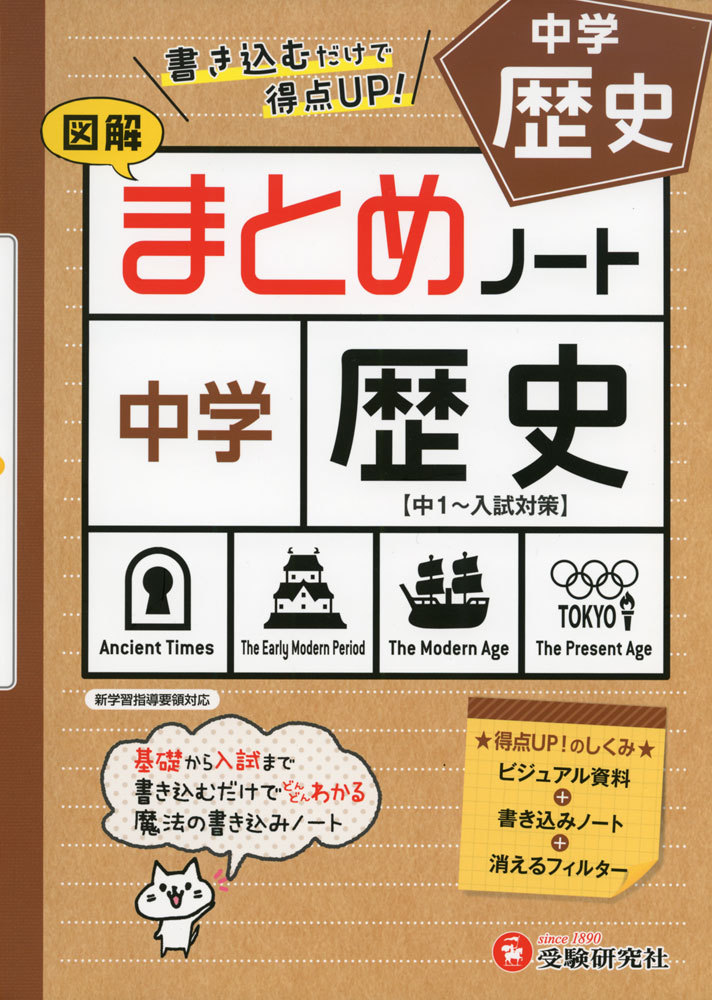 地図や図表に直接書き込みながら覚えるノート式。歴史の重要事項をおさえる180の図表を掲載。820の人名・用語をカバー。「合格テク」「得点UPポイント」「記述Q」などのコーナーは、定期テストから高校入試対策まで役立つ。