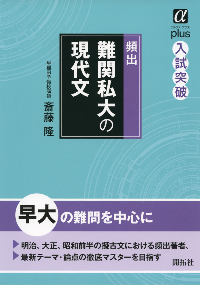 主として早大の入試問題を解くことにより、難関私大入試の現代文問題に対応しうるハイレベルの実力を養成するための参考書。解説書によって正解が異なるような設問が多く含まれる難問を、よりすぐって作成。明治・大正・昭和前半期の難解な文章に対応できる読解力の強化、受験生が一般的に苦手意識を持っている、近代批判、現代文明批判(特に、IT革命、家族制度、愛など)、哲学、芸術論、エッセイ・小説といったジャンル、論点、テーマのマスターを目指す。