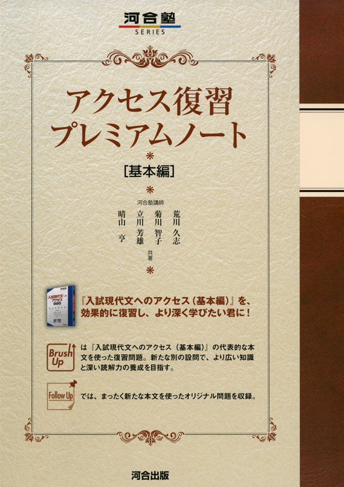 「入試現代文へのアクセス 基本編」専用のワークブック。「Brush Up」では、復習問題を8題収録し、新たな別の設問で、より広い知識と深い読解力の養成を目指す。「Follow Up」では、まったく新たな本文を使ったオリジナル問題を4題収録。