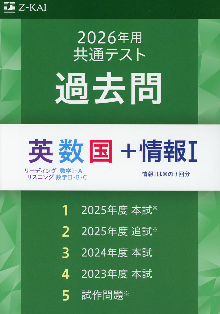 英数国は、2025年度本試も含む各4回分(2025年度本試、2025年度追試、2024年度本試、2023年度本試)と令和7年度試験の試作問題を、情報Iは2025年度本試、2025年度追試、令和7年度試験の試作問題を収録。