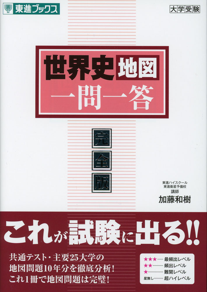 世界史の需要な地図・地名の知識を効率よく覚えられる、一問一答形式の問題集。特に重要な地図にはワンポイントアドバイスを付け、「地図のどこに注目すべきか」を解説。地図中には頻出の地名などの重要事項のみを記載。