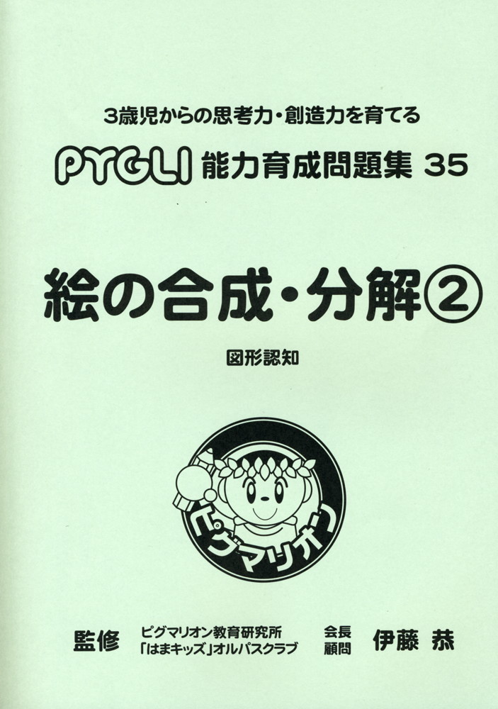 幼児教育法「ピグマリオンメソッド」を基にして作られた問題集。左の絵の欠けている部分を見つける問題を収録。