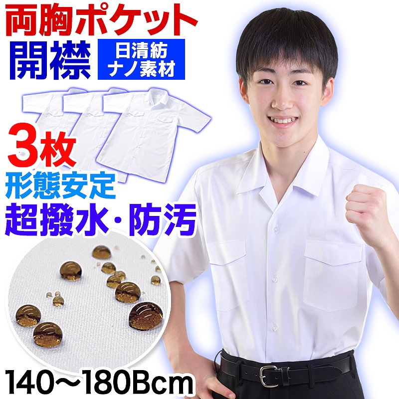 スクールシャツ 3枚セット 開襟シャツ 両胸ポケット 半袖 nano超はっ水防汚加工 日清紡 形態安定 蛍光白 ホワイト 制服 大きなサイズ 小さいサイズ 送料無料