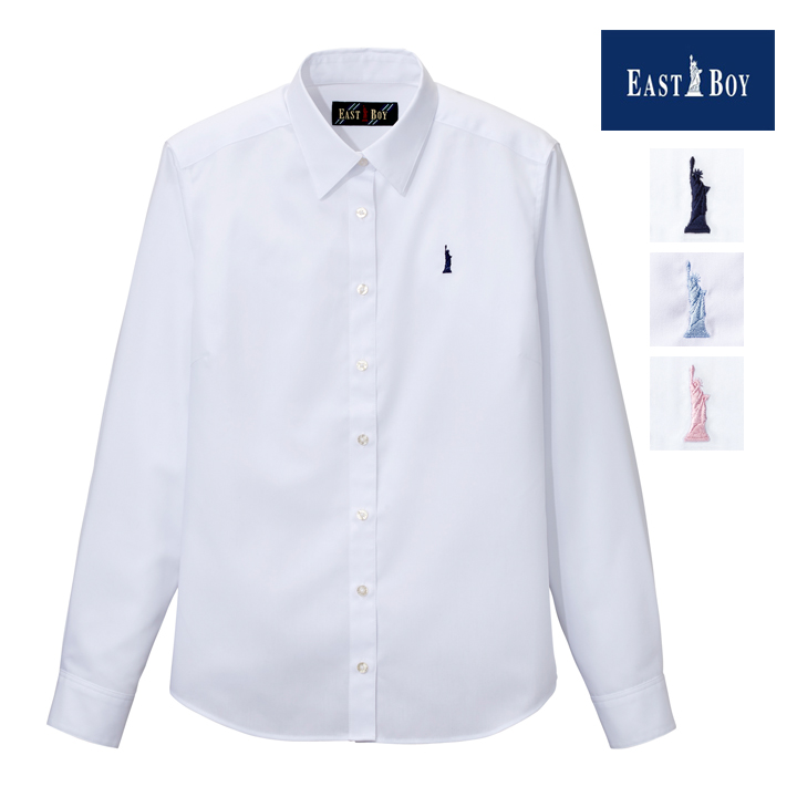 EAST BOY スクールシャツ 女子用 長袖 ブラウス 白 女神刺繍入り 9-11号 形態安定加工ポプリンシャツ〈モイストキュア加工〉