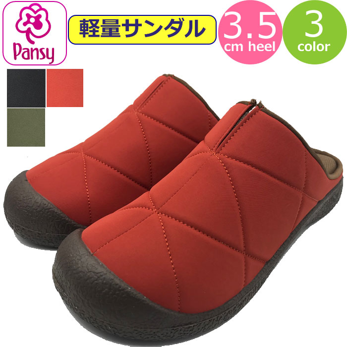Pansy パンジー サンダル キルティング 女性 防寒サンダル 婦人 冬サンダル 軽量 靴 シューズ つっかけ コンフォートサンダル カジュアル 軽い オフィスサンダル 黒 ブラック 赤 レッド カーキ!アウトドアテイストのキルティングデザイン。アーチサポートインソールが足に優しい。履き口にゴム素材を使用し、甲にフィットしやすい。ゴム素材の滑止付きソール。一体成型製法でソフトでフレキシブルな履き心地。外履きはもちろん、オフィス・事務所履きとしても。