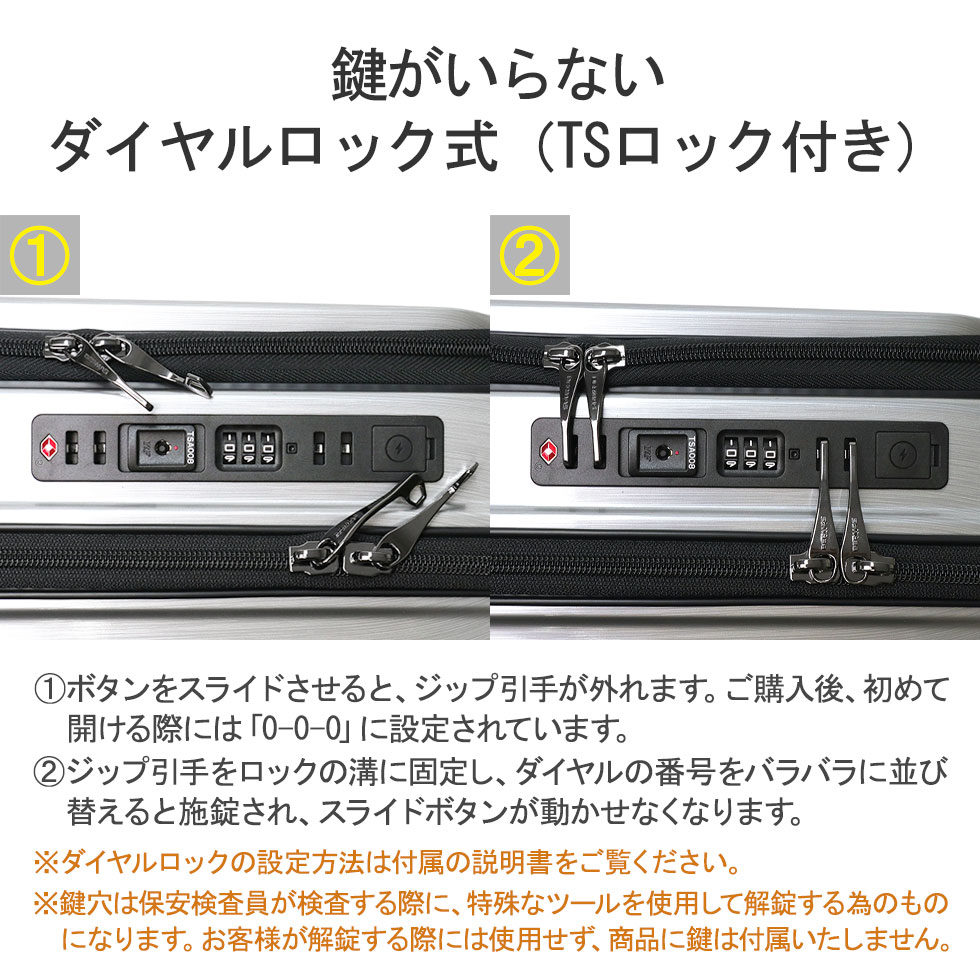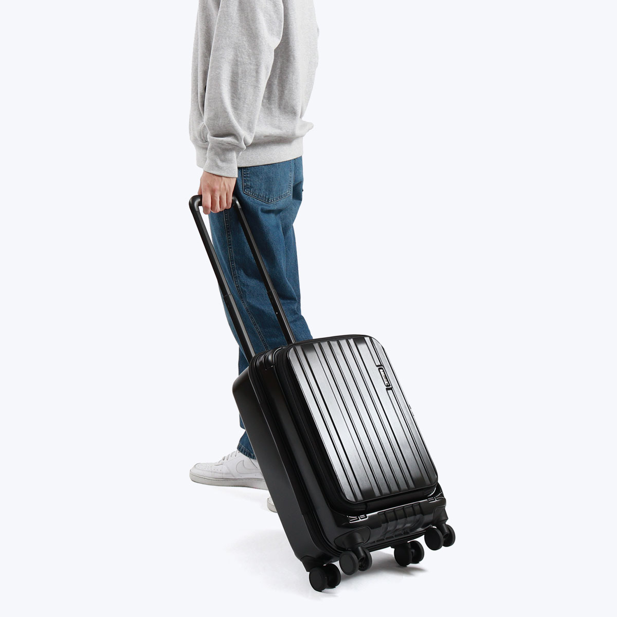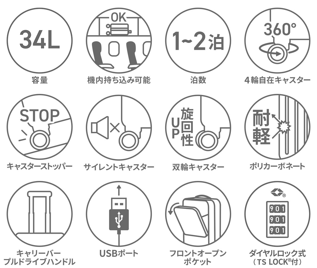 充実の機能性でビジネストリップ・旅行をより快適にする、機内持ち込み対応のスーツケース。本体には、スマートフォンなどの機器の充電に便利なUSBポート2口付きのTSロックを装備。USBポート用のモバイルバッテリーはフロントポケット内部のマチ付きポケットに収納可能です。さらに、フロントオープンには、13インチ対応のPC収納を装備し、いつでもデバイスに手が届く設計に。安心のダイヤルロック式TSロックを備えている、安心設計もポイントです。