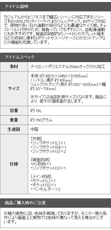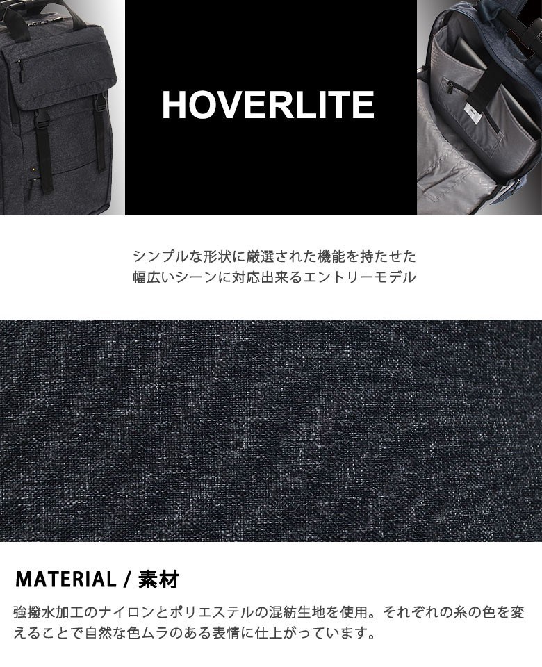 カジュアルからビジネスまで幅広いシーンに対応できるシリーズ『HOVERLITE/ホバーライト』のリュックサック。B4サイズ対応で、荷物が多い日の通勤や旅行などにも最適なサイズ感です。