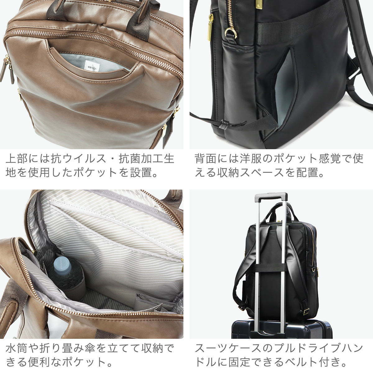 シンプルでスリムな女性向けビジネスリュックシリーズ『FITEMME CLASS/フィッテムクラス』。ビジネススタイルに合わせやすいデザインと上品な素材で展開しました。電車内などで前持ちした際も邪魔になりにくい、スリムでコンパクトなシルエットながら14.0インチのノートPCやA4ファイルに対応、使いやすさにこだわった機能がたくさん備わった収納力抜群のアイテムです。