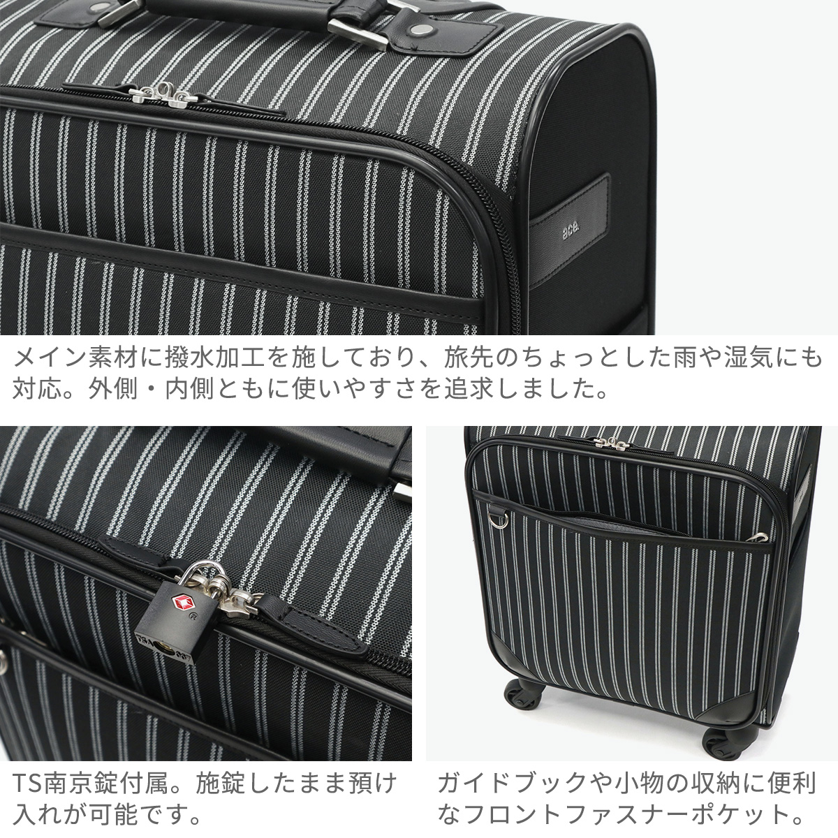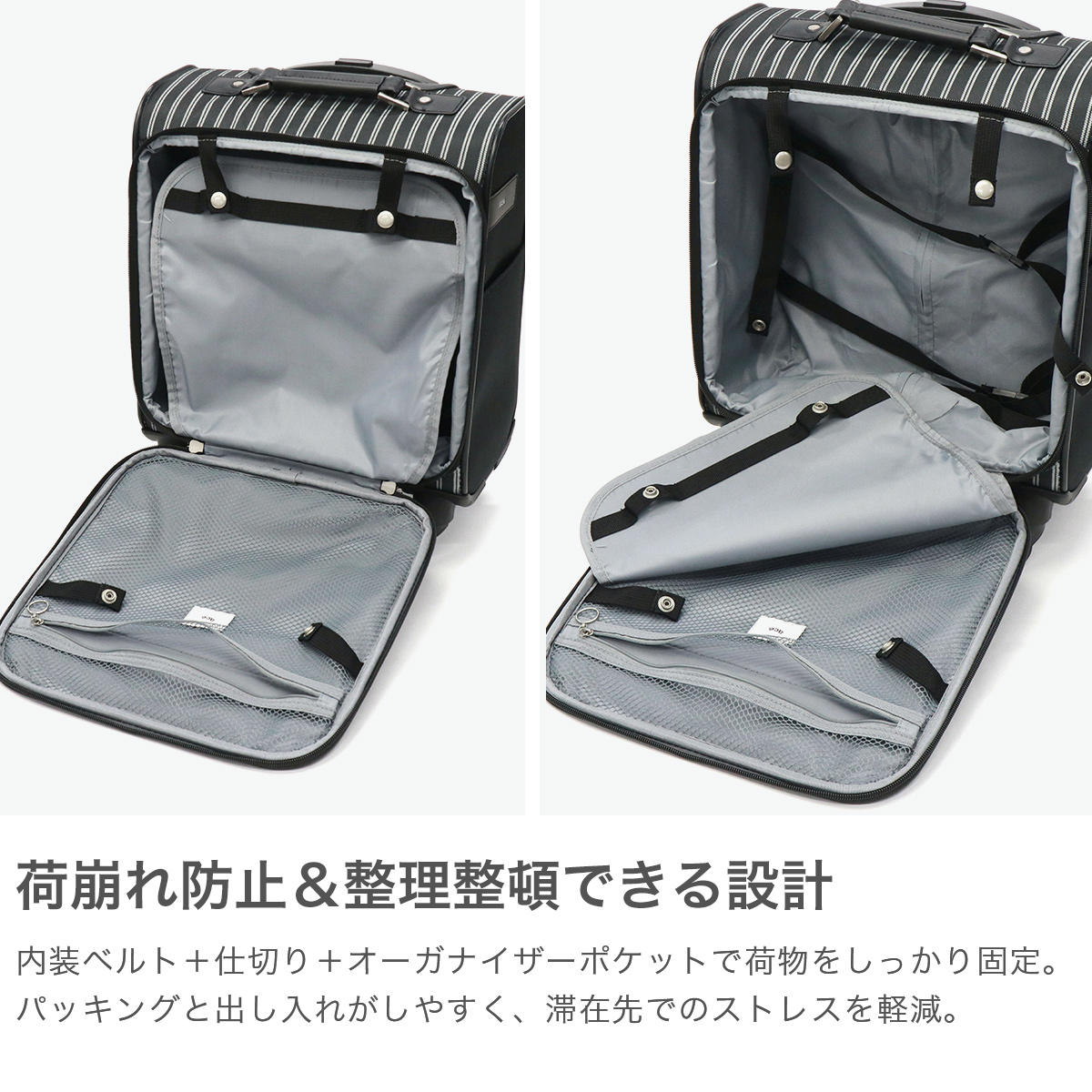 普段使いから1?2日の旅行まで活躍するソフトキャリー。撥水・抗菌加工を施した生地を使用しており、快適にお使いいただけます。移動中に荷物が取り出せる縦開き仕様や、荷崩れを防ぐ内装ベルトなど、便利な機能が満載。TS南京錠も付属し、セキュリティも安心です。軽量かつコンパクトなサイズ感により、持ち運びや移動がストレスフリーに。スタイリッシュなデザインで、幅広い世代におすすめのアイテムです。