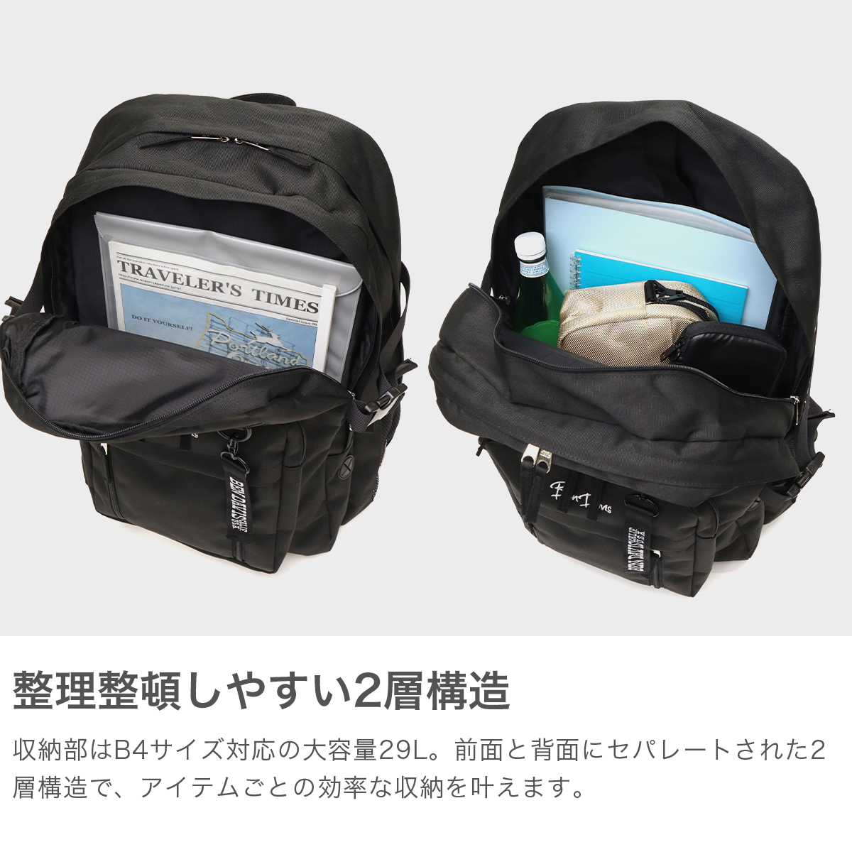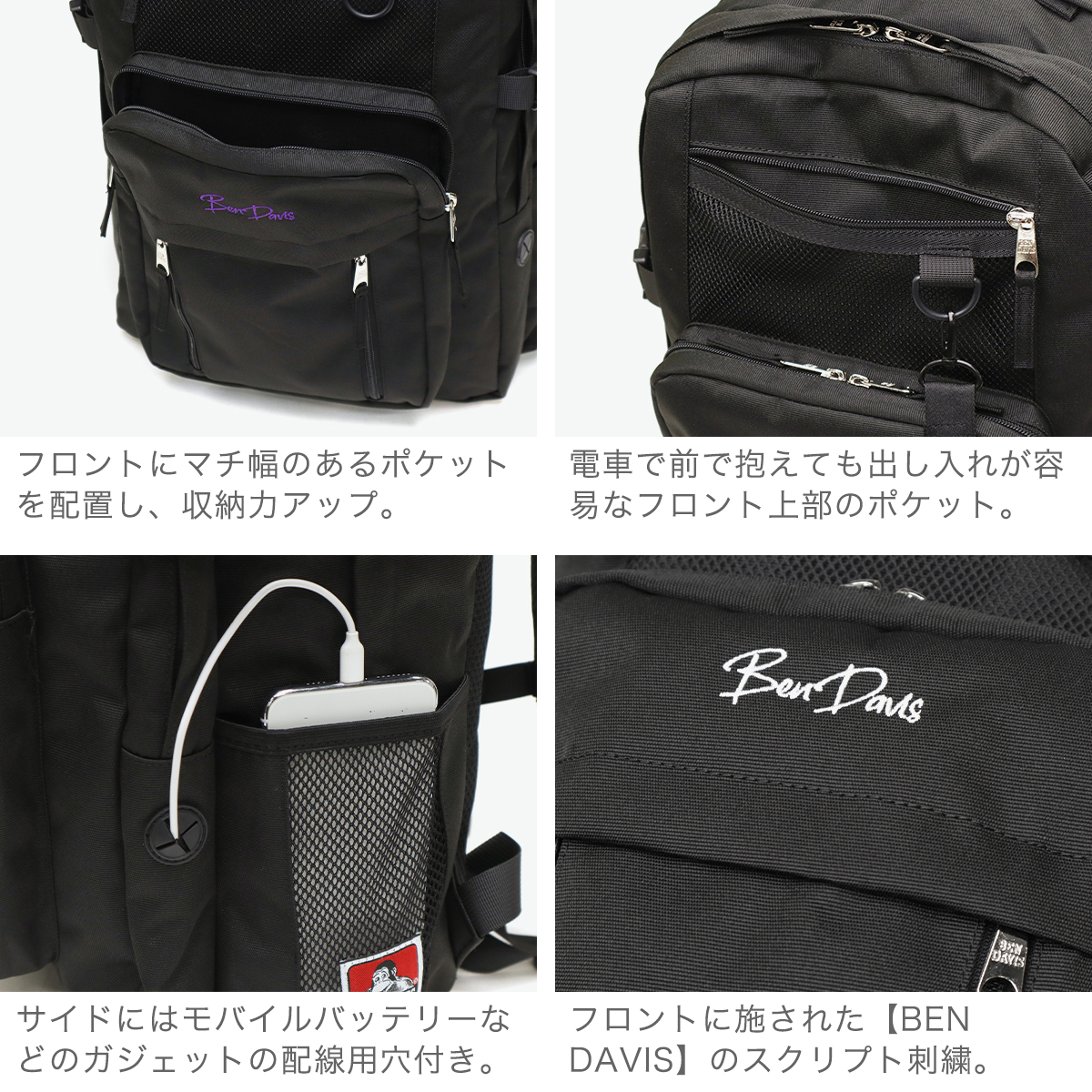 B4対応の2層構造で整理しやすく、収納力抜群の大容量リュック。撥水加工が施され、雨の日も安心です。フロントのロゴ刺繍とメッシュポケットがスポーティーなアクセントに。サイドのコードホールで配線もスムーズ!機能性とデザイン性を両立し、男女問わず使いやすいアイテムです。
