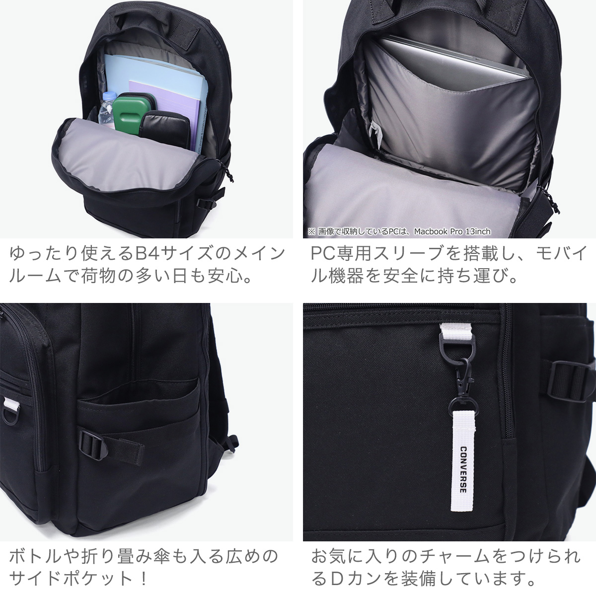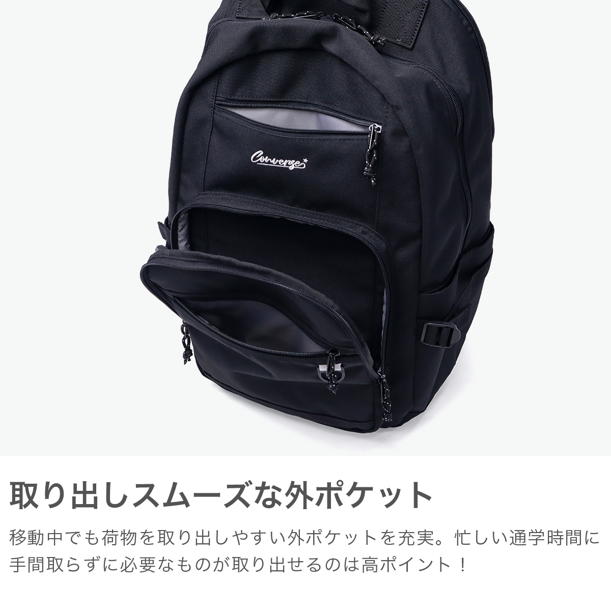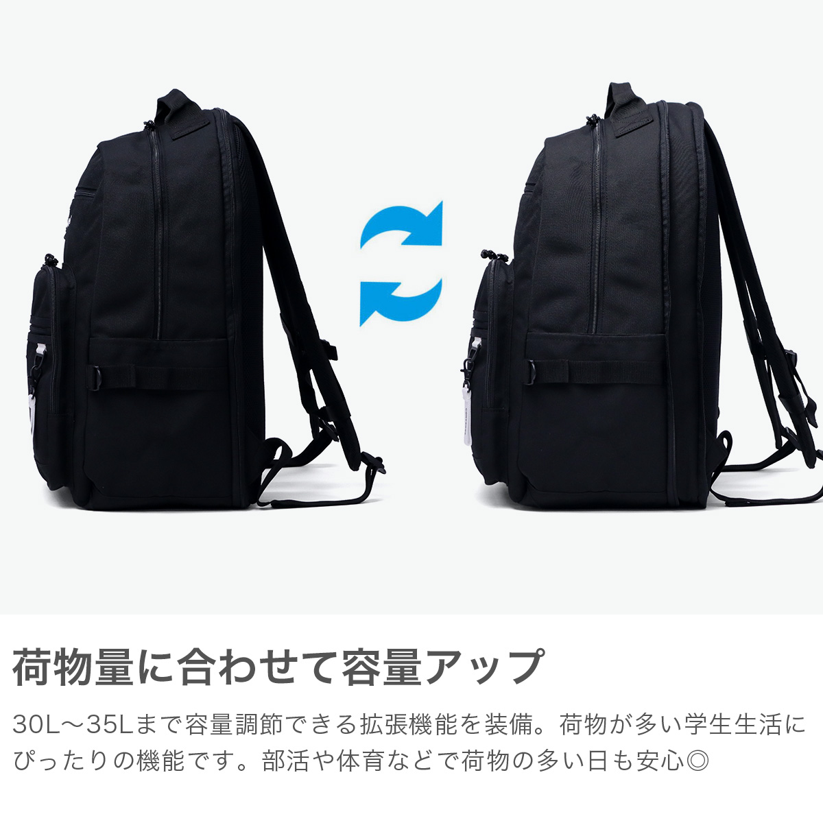 容量30〜35Lまで拡張できる機能が嬉しいリュックサック。荷物が多くなる部活の日でも安心!大きく開く開口部で荷物の取り出しがスムーズに行えます。ボトルや折り畳み傘も収納できる便利なサイドポケットやPC収納部も備えた、通学に最適なアイテムです。