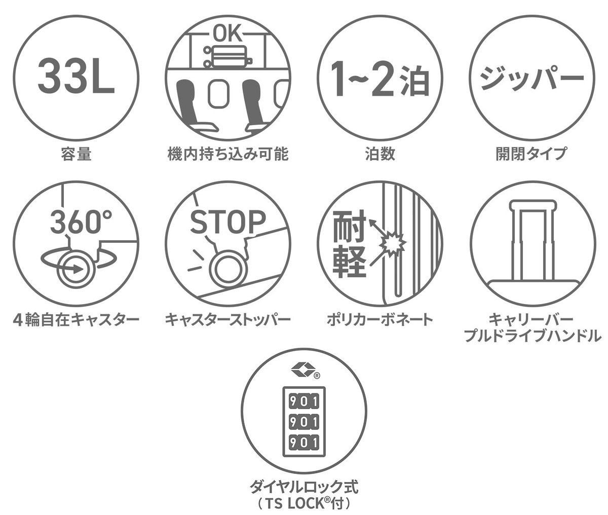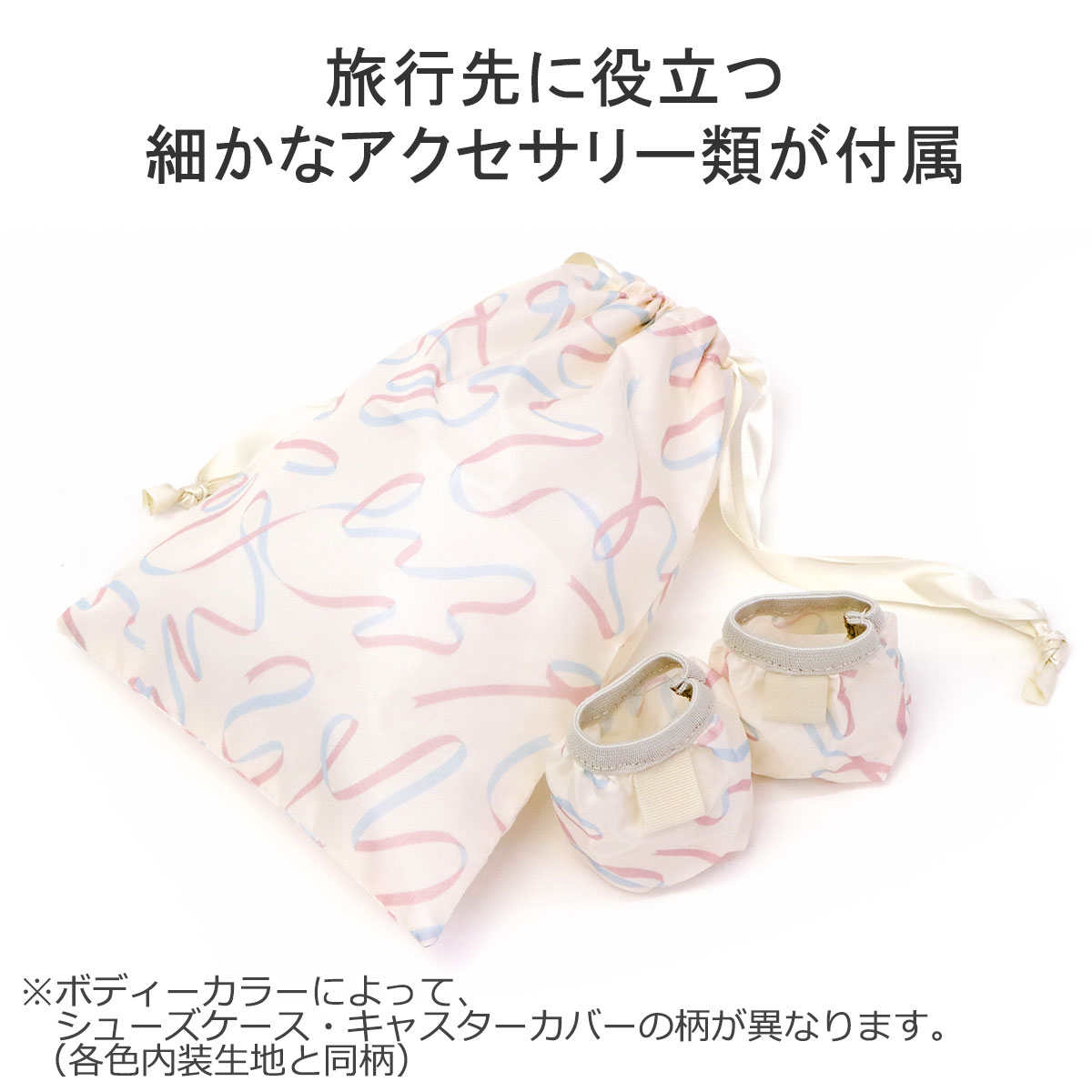 | 仕様 | <内側> ジップ収納×2 └ 内蔵 クロスベルト×各1 ジップポケット(M)×2 <付属品> シューズケース×1 キャスターカバー×5 クリアポーチ×1 |