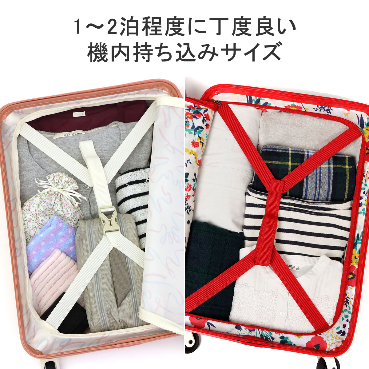 33L容量の収納部は、1〜2泊程度の旅行にぴったり。可愛いだけでなく機能的で使い勝手に優れたつくりが魅力です。開けた際に荷物が見えないだけでなく、荷崩れを防ぐ仕切りやベルトを備え、小物類をたっぷり収納できるマチ付きのジップポケットも備えています。