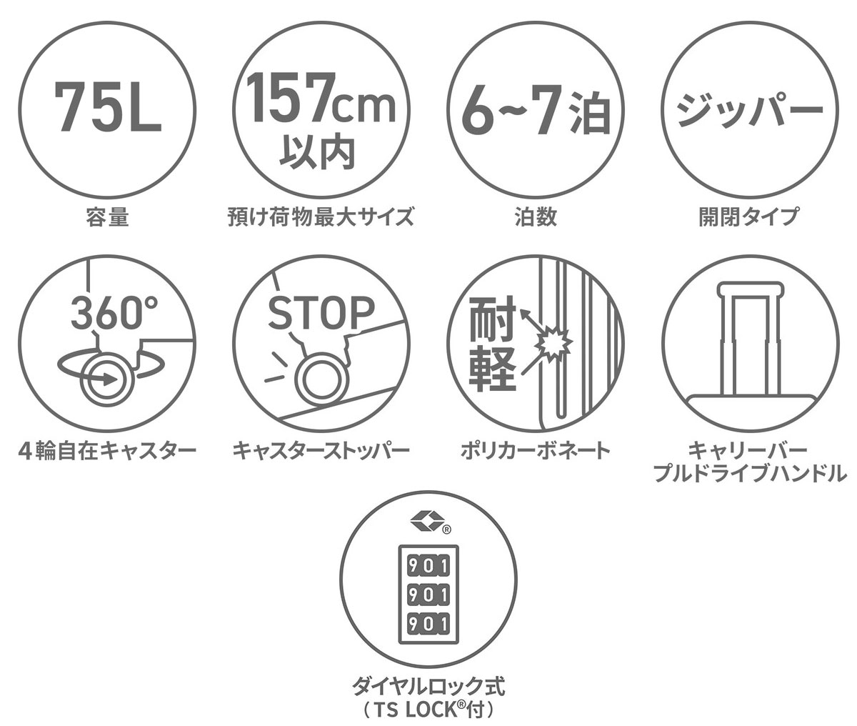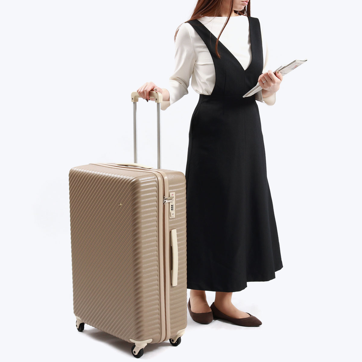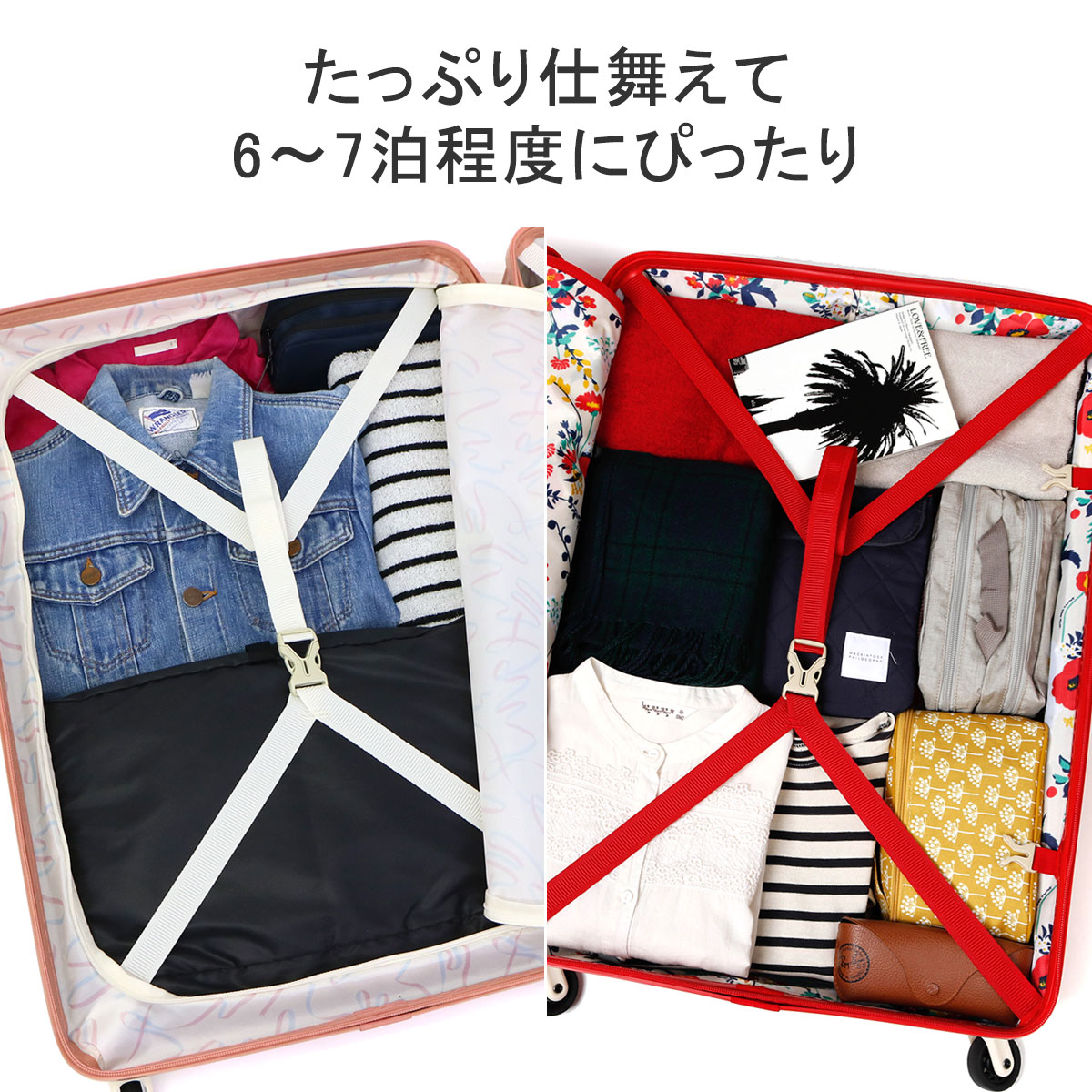 75L容量の収納部は、たっぷり仕舞えて6〜7泊程度の旅行にぴったり。可愛いだけでなく機能的で使い勝手に優れたつくりが魅力です。開けた際に荷物が見えないだけでなく、荷崩れを防ぐ仕切りやベルトを備え、小物類をたっぷり収納できるマチ付きのジップポケットも備えています。