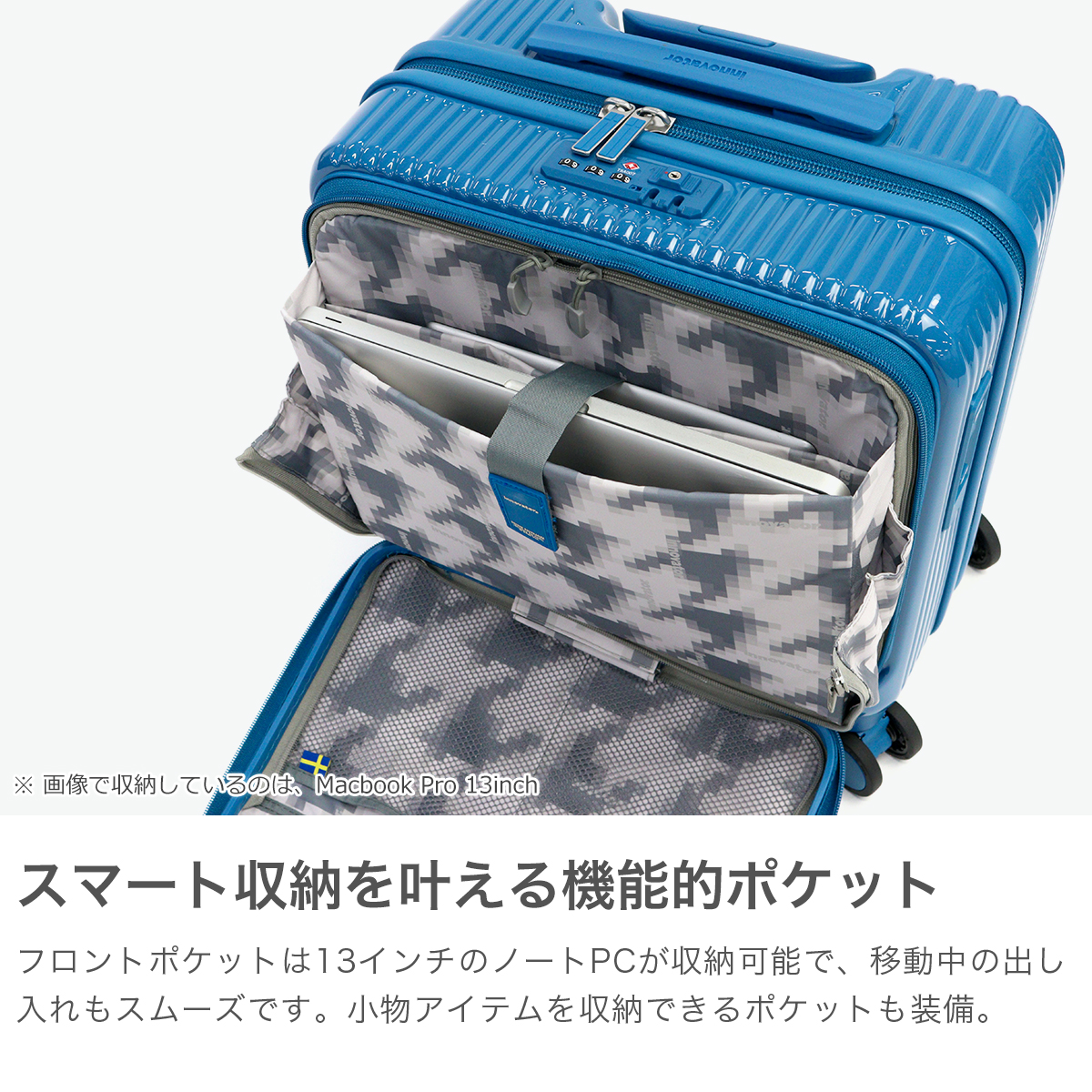 容量33Lで機内持ち込みが可能な小型キャリーケース。本体表面に鏡面加工を施したデザインがポイントです。フロントにはクッション性のあるPC収納とタブレット収納を搭載しており、ビジネスシーンにも最適です。フロントからメインへアクセスできるため移動中の小物整理もスムーズ。ワンタッチブレーキが揺れを抑え、静音双輪キャスターが快適な走行をサポート。北欧テイストのカラーとデザインも魅力の、強度と機能性を兼ね備えた一台です。