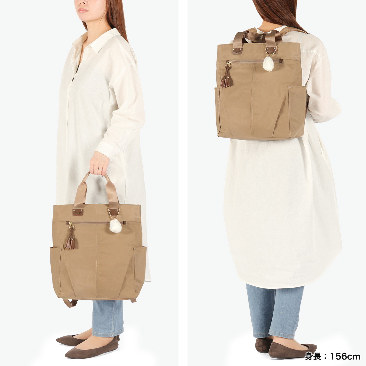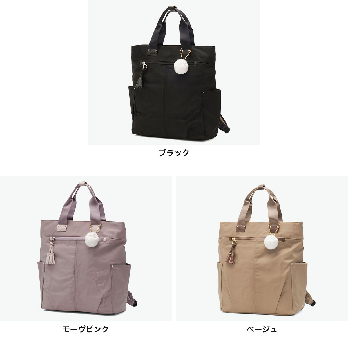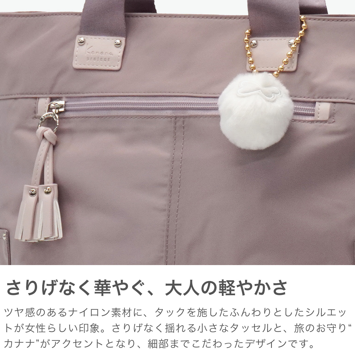 小さなタッセルをあしらったカジュアルバッグシリーズ『タッセル』から登場したトートリュック。ツヤ感ナイロン×フェイクレザーで上品に仕上げ、タック入りのふんわりシルエットが魅力。内装はピンクをベースにした木漏れ日柄で明るい印象。長めのハンドル付きで、シーンに合わせて手持ちでも背負っても使える2WAY仕様。A4サイズ対応で女性でも背負いやすく、ポケットも充実。毎日使いから旅行まで幅広く活躍します。
