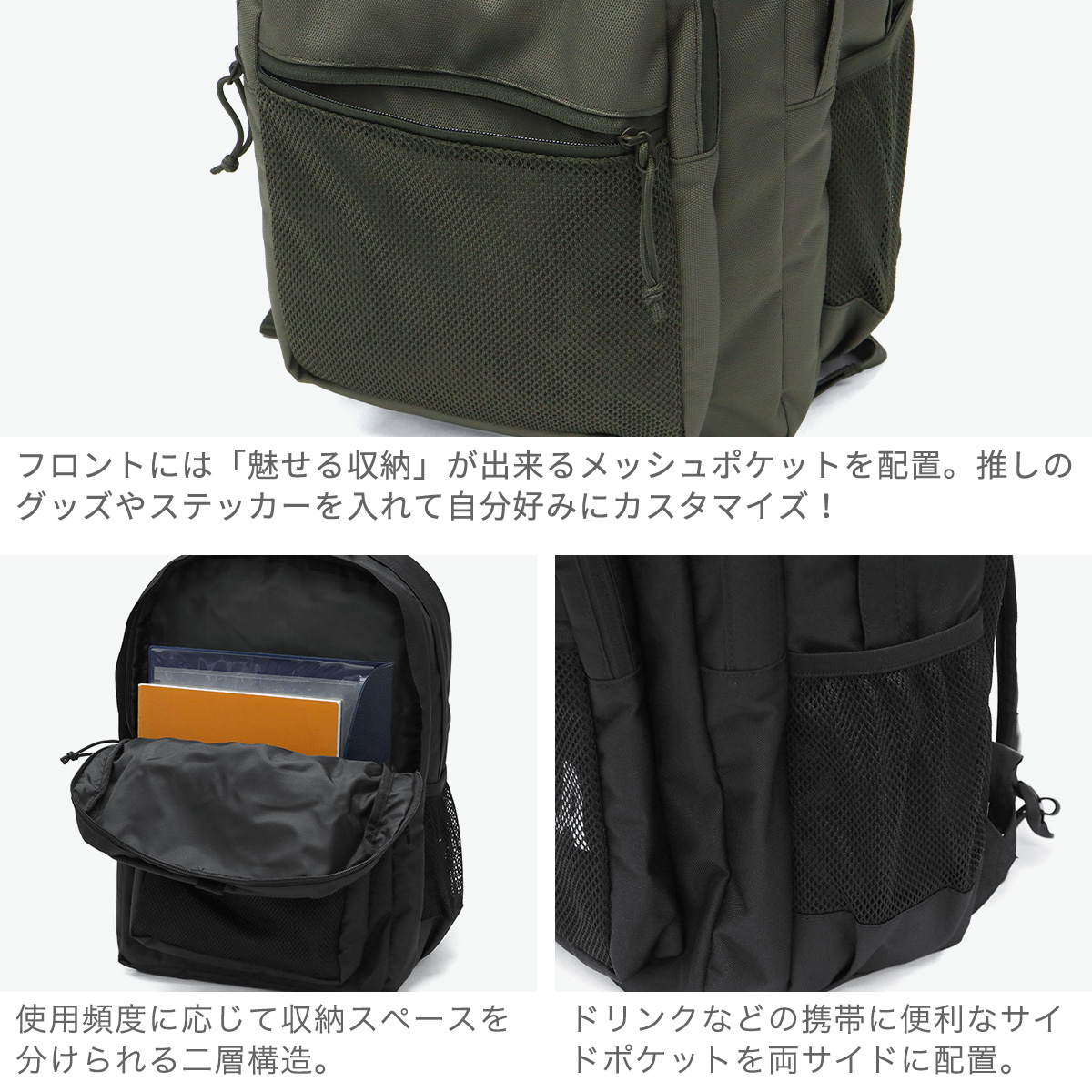 35Lの容量を持つ、四角いフォルムが特徴的なバックパック。大きく開く収納部はシンプルな設計で、アイテムを自分らしく効率的に収納することができます。また、アイテムをサイズや使う頻度によって分別できる2層式のため、日々多彩なアイテムを多く持ち歩く学生に最適なつくりとなっています。