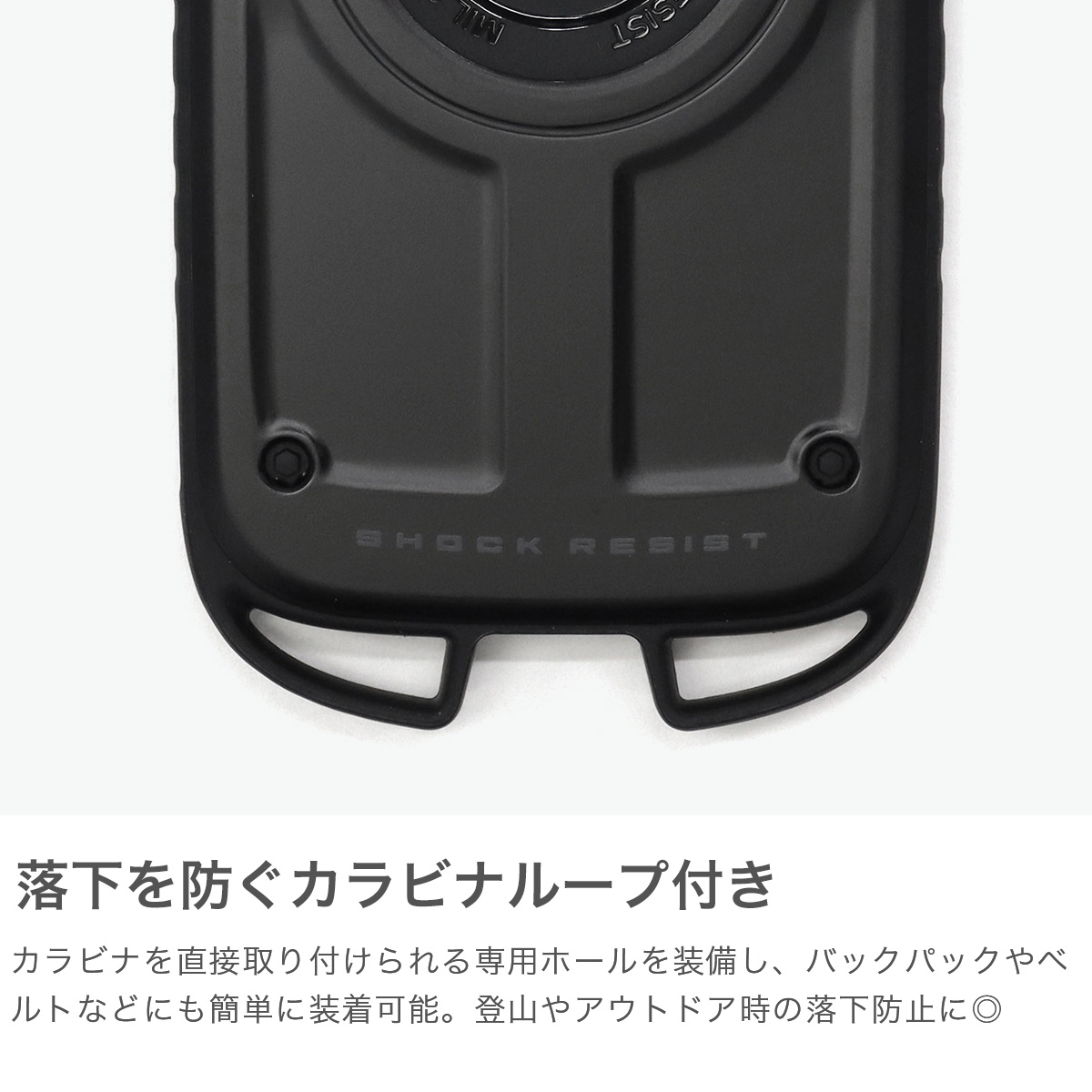 米国MIL規格準拠の耐衝撃性&PCとTPUの2層構造で衝撃吸収力を兼ね備えた、MagSafe対応のiPhone16e専用ケース。かつての「アウトドア」のイメージにあった大きい・ゴツい・タフネス過ぎる外見を覆しつつもパワフルさを感じさせるスタイリッシュなデザインに仕上げました。登山やアウトドアの落下防止に役立つカラビナループを搭載するなど、あらゆるフィールドでタフに使えるアイテムとなっています。