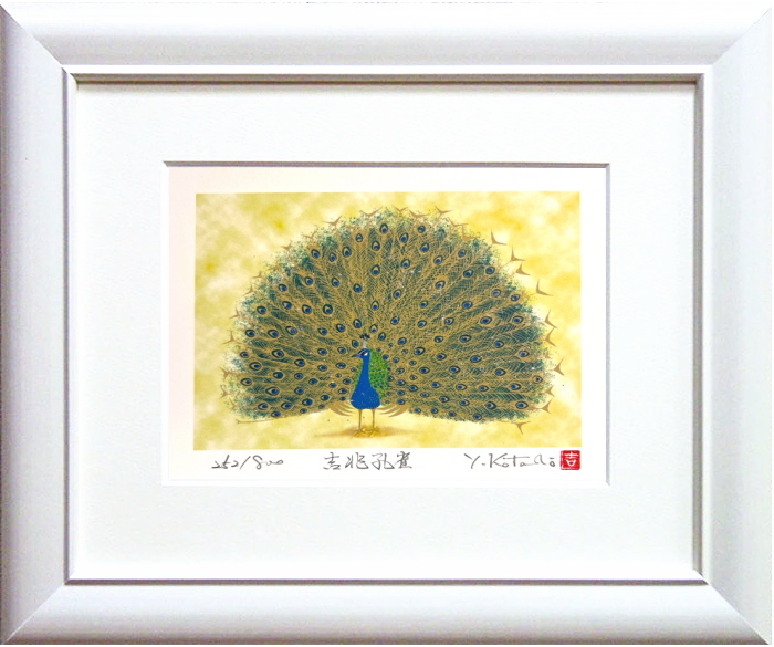 吉岡浩太郎 「 吉兆孔雀 」(インチ判) ジグレー 版画 版画 絵画 風水 鳥 くじゃく 縁起 白い額 小さい版画