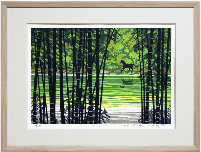 藤田不美夫 「 川岸の竹林 」 木版画 版画 絵画 風景 新緑 馬 自然 送料無料