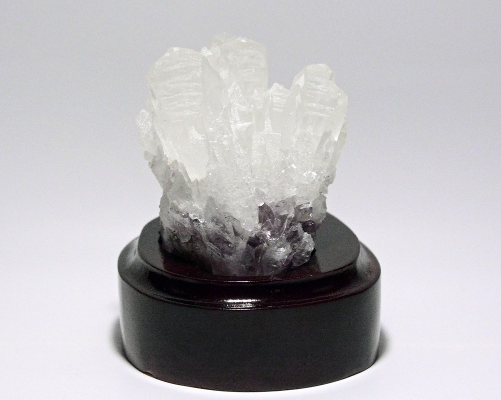 アメシストを土台にして成長したカルサイトが美しく造形した後、さらにカルサイトにクォーツが細かくまとわりついた珍品。ミュージアム向けコレクションです。横:7.5cm 高さ:10cm 重量:457gs。木製台座付きウルグアイ産。近県の方は、ご来店の上、実物をお確かめください。