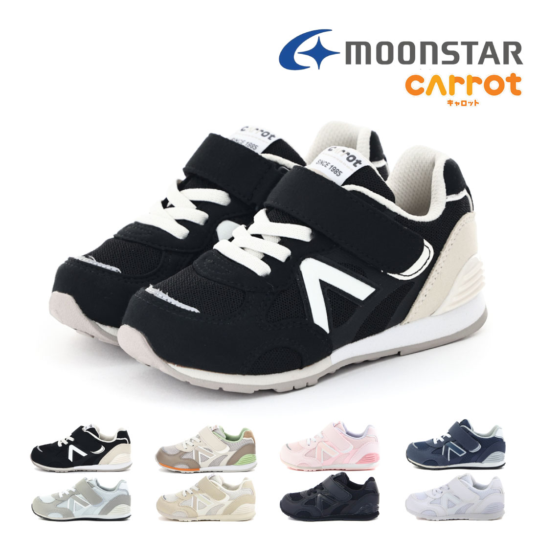 | 特長 | 「こどもの足にいいことぜんぶ」の想いから生まれた機能シューズ「ムーンスター キャロット」HI!!シリーズのキッズシューズです。ワンタッチで脱ぎ履きできる一本バンドタイプです。レトロクラシックな雰囲気とオールジェンダーな色味で様々な服装に合わせやすい一足です。子どもの足の成長をサポートする「4つの機能(つま先ゆったり/カウンターボックス/フレックスジョイント/機能性カップインソール)」により、健やかな成長を促します。【つま先ゆったり】つま先にゆとりを持たせた形状で、足の指を圧迫せずにのびのび動かせます。【機能性カップインソール】足裏になじみ、取り出して洗濯ができるので靴内を清潔に保てる中敷きです。つま先部分に一般的なEVAスポンジより30%以上反発性をアップさせ衝撃吸収性能も兼ね備えた高反発スポンジを採用しており足ゆびの動きを促します。また、中敷きの屈曲部を波型形状にすることで、靴の屈曲部がより曲がりやすいように設計されています。かかと部分には硬質EVAパーツを使用しており、安定性を高めています。【スタビライザー】かかとに取り付けられた硬質のパーツが足のグラつきを抑え、着地時の安定性を保ちます。【カウンターボックス】子どもの柔らかくゆがみやすい足を箱型構造でしっかり支えます。【フレックスジョイント】足の曲がりと同じ位置で靴が曲がる設計で、足に余計な負担をかけません。【カテキン】天然緑茶を原料とした自然素材の「カテキン」を使用することで、優れた「抗菌」「防臭」効果を発揮します。
