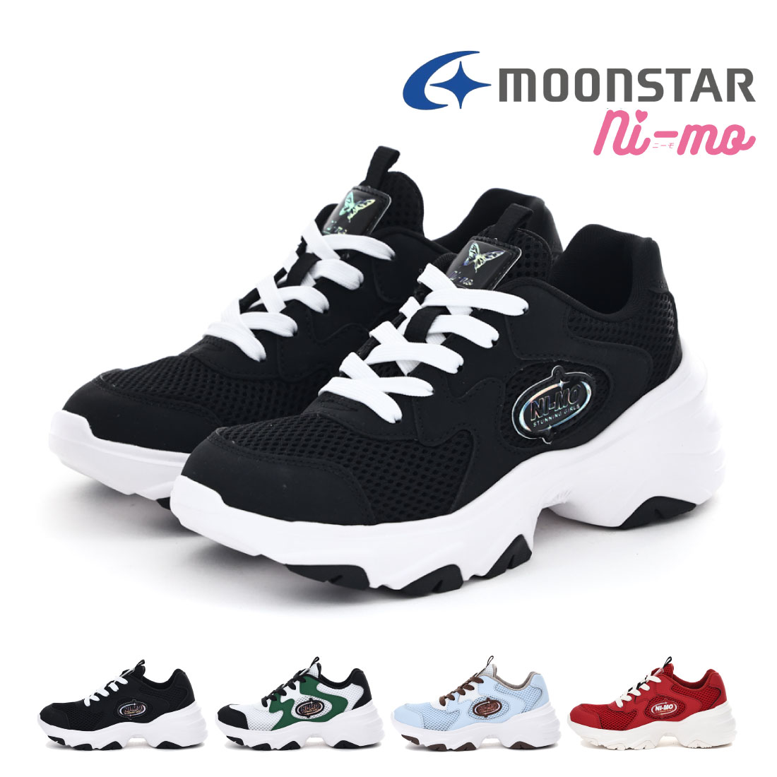 | 特長 | 女の子のかわいく、オシャレになりたい気持ちを応援する「ムーンスター ニーモ」のガールズ向けスニーカーです。Cawaii Plusとしては#スタイルアップ見せ #においケア を備え、女の子のかわいくなりたい気持ちを応援します。【Ag+抗菌防臭】銀イオンの抗菌作用でにおいのもととなる菌の増殖を抑制し、防臭効果を発揮します。【洗えるインソール】足裏になじみ、取り出して洗濯ができるのでいつも清潔に保てます。Cuugalコラボ商品です。サイドのサークルロゴや蝶モチーフがロックでかっこいいアイテムです。トレンドのグランジっぽい雰囲気をちょうど良くプラスしました。脚が長くきれいにスタイルアップして見えるような工夫を盛り込んでいます。