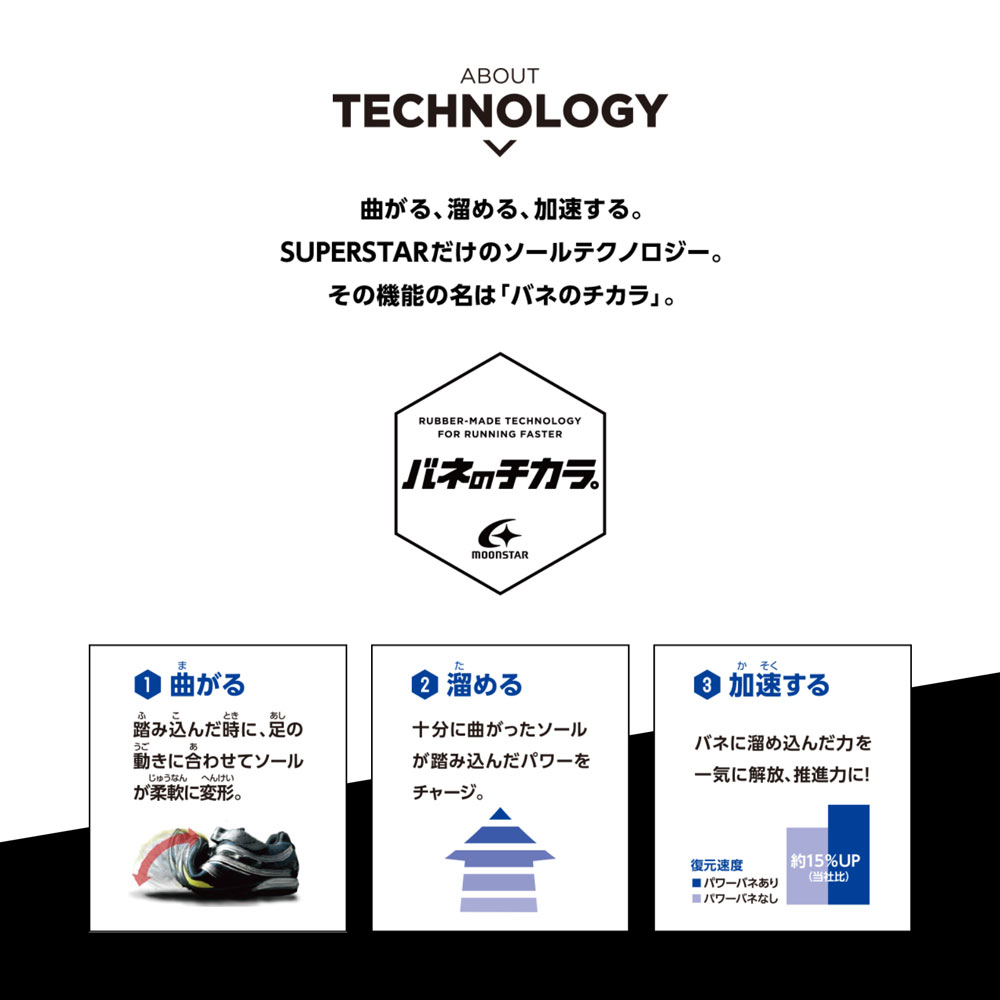 【パワーバネ】ムーンスター独自開発の特殊なゴムを靴底に搭載し、地面を踏み込むときにパワーを蓄積し、蹴り出すと同時に一気にパワーを推進力に。