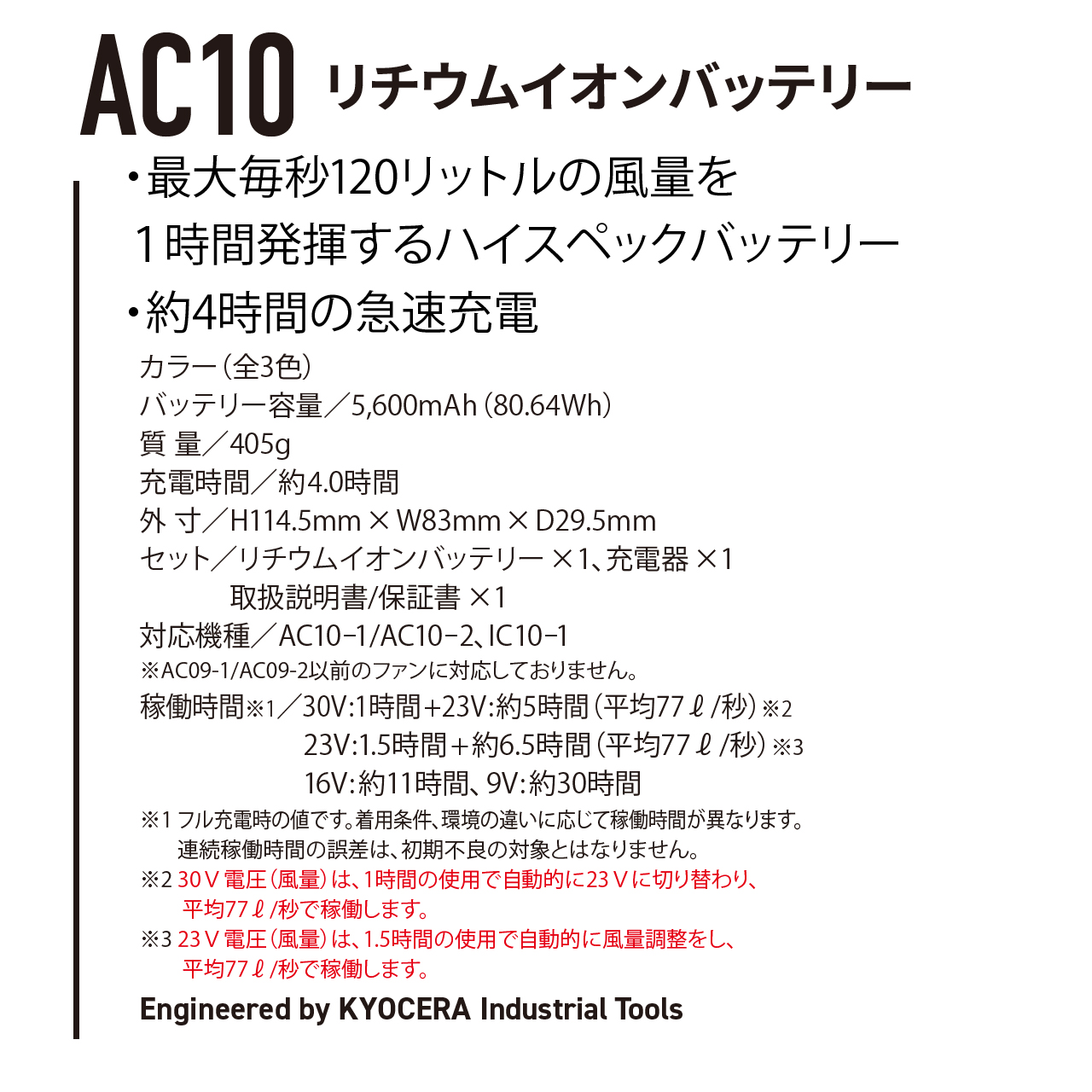 稼働時間※1/30V:1時間+23V:約5時間(平均77リットル/秒)※2