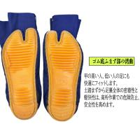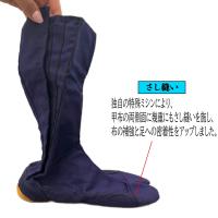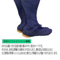かかとは縫い付け足袋の最も傷みやすい部分の一つです。そのため、皮尻は厚織りの綿布に中芯を入れて潰れ防止を図るとともに、力王開発の特殊ミシンによるかかと巻き上げ補強ゴムが縫い付けられています。